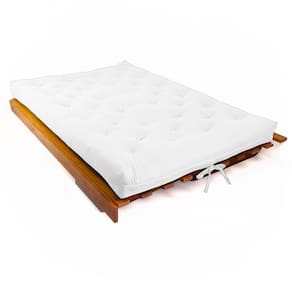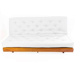 Material e estrutura: O colchão futon casal é fabricado em tecido de alta qualidade em Sarja Impermeável importado, seu enchimento é de mantas de algodão natural, manta de fibra siliconada estruturado por espuma ortopédica D28, possui amarras nas extremidades, para melhor fixação do futon. A estrutura é produzida em madeira nobre maciça de grápia, com pintura natural.