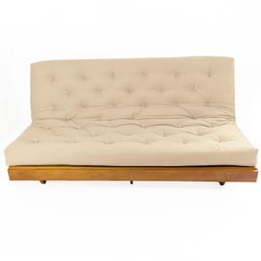 Material e estrutura: O colchão futon casal é fabricado em tecido de alta qualidade em Sarja importado, seu enchimento é de mantas de algodão natural, manta de fibra siliconada estruturado por espuma ortopédica D28, possui amarras nas extremidades, para melhor fixação do futon. A estrutura é produzida em madeira nobre maciça de grápia, com pintura natural.