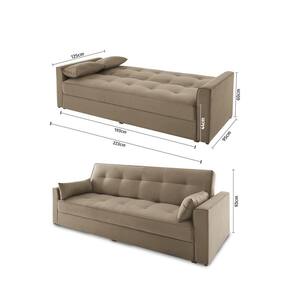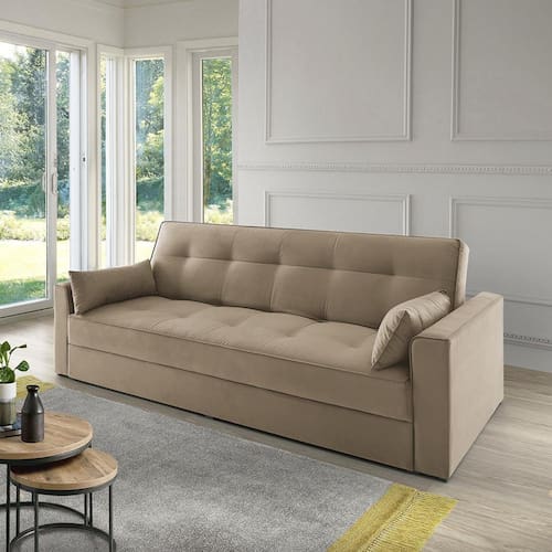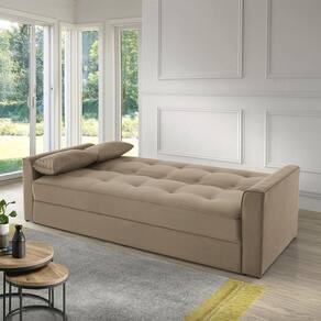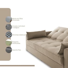 Assentos com espuma flexível de poliuretano densidade 26kg/m, certificada, fabricação própria, utilização de feltro como camada isolante, sustentados por percinta elástica e mola espiral. Com assento fixo e encosto com 3 estagio de declínio ele deita totalmente virando uma cama . Enchimento do encosto: espuma D-26 e fibra de poliéster siliconada. Estrutura de madeira maciça de pinus e eucalipto 100% reflorestada. Fixação da estrutura: grampos galvanizados anti-ferrugem. Apoiados no chão com sapatas de pvc. Revestimento/tecido: suede 100% poliéster, com toque macio.
