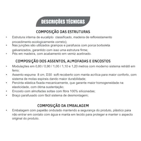 COMPOSIÇÃO DOS ASSENTOS, ALMOFADAS E ENCOSTOS • Modulações em 0,80 / 0,90 / 1,00 / 1,10 e 1,20 metros com moderno sistema retrátil em ferro; • Assento espuma 8 cm, D30 soft recoberto com manta acrílica para maior conforto, com sistema de molas espirais dando maior durabilidade; • Percinta elástica fixada mecanicamente, que garante maior homogeneidade na elasticidade, com ótima sustentação; • Encosto com almofadas soltas com fibra 100% siliconadas; • Braço parafusado com fácil sistema de desmontagem;