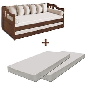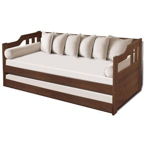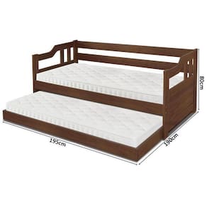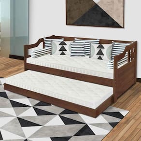 Também conhecido como bicama, bibox, cama com auxiliar e sofa cama.Ótimo para receber visitas, colocar no quarto de hospedes ou até mesmo na sala de estar Sofa cama com colchãoMadeira maciçaEstrutura do material:Barras com 25mm e braços laterais com 20mmEspessura da cama auxiliar 22mmAcabamento em Verniz PU Semi BrilhoPeso suportado por pessoa:Sofá Cama 200kgCama auxiliar 120kg4 Pés em madeiraEspessura dos pés 90mmx25mmRipas em Compensado Naval 70mm x 10mmSarrafos em Eucalipto com espessura de 22mm x 45mmColchão com espuma D20Complexidade da montagem: Média, pode ser montado por apenas uma pessoa e/ou necessite de maior conhecimento para montagem.