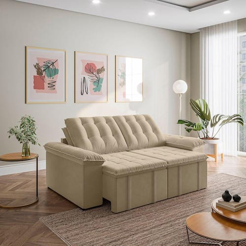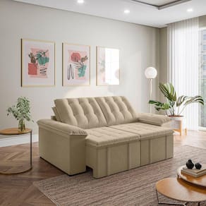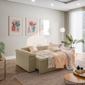 O Sofá Cama Palmeira MadeiraMadeira é a solução perfeita para quem tem pouco espaço disponível. Com ele você poderá acomodar suas visitas com conforto e praticidade. Produzido em madeira maciça de eucalipto, com as seguintes medidas (A x L x P): 103cm x 200cm x 112cm e suporta até 400kg. Depois nos conte como foi a experiência de compra e como ficou seu ambiente nos comentários! Produto Montado: Sim Altura do assento até o chão: 48.0000 Ambiente Principal: Sala de Estar codigo_ean: 7909903193099 Complexidade da Montagem: Baixa: pode ser montado por uma pessoa sozinha Cor: Bege Enchimento do Encosto: Fibra Siliconada Estilo de Braço: Braços Pillow Top Manual de Montagem e Instalação: https://product-hub-prd.madeiramadeira.com.br/814318/documents/48d7ea00-c9d0-4573-962a-0725aaabc2cc8aef38226ManualSofPalmeira.pdf Material dos Pés: Plástico Modelo: Sofá Bipartido Necessita Montagem: Sim Origem do Produto: Nacional Pet Friendly: Não Possui Baú: Não Possui Rodízio: Sim Profundidade Quando Estendido: 148 Recomendações de Uso, Manutenção e Limpeza: Evitar exposição direta à luz solar, limpar com escova macia e aspirar o pó semanalmente, não utilizar produtos químicos, removedores, alvejantes, etc. Evite exercer pressão excessiva sobre determinada partes do estofado, não utilizar para limpeza equipamentos a vapor de água. Sistema de Montagem: Parafusos e Engates Tipo de Mola: Molas Bonnel