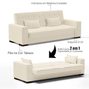 Escolher o Sofá cama correto pode ser uma tarefa difícil, pois, dependem de muitos fatores como espaço disponível, conforto, beleza e tipo do tecido, para te ajudar, apresentamos o Sofá Cama Lisboa! Ele possui 2 posições podendo ser utilizado como sofá e também como cama, caso receba alguma visita que venha passar a noite. Ele é produzido em madeira de eucalipto, seu estofamento apresenta todo o conforto da espuma D-23 e o assento é composto com percintas elásticas garantindo qualidade e durabilidade ao produto.