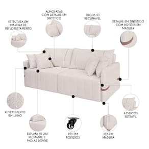 Revestido com o mais fino linho, oferece uma textura suave ao toque, enquanto os detalhes em sintético nos braços adicionam um toque de sofisticação. Os botões de madeira cuidadosamente inseridos destacam-se, proporcionando um visual clássico e atemporal. Para garantir o máximo conforto em sua Sala De Estar, este Sofá 4 Lugares acompanha almofadas e encosto com plumante, percintas elásticas e molas Bonnell, que juntas criam uma experiência de assento e sono excepcional. Os pés 3cm em madeira cor mel não só reforçam a robustez da estrutura, mas também complementam o design com sua beleza natural. Ah! Além de tudo, esse Sofá Retrátil possui rodízios em silicone facilitando a abertura. Ideal para quem busca praticidade sem abrir mão do estilo, este sofá-cama é uma adição luxuosa a qualquer ambiente.