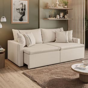 Importante sobre a entrega: A entrega é realizada até a portaria ou porta de entrada do endereço indicado, desde que o acesso seja permitido. Para locais com portaria, a entrega será feita no piso térreo. Não realizamos montagem, desmontagem, transporte por escadas ou içamento. É responsabilidade do cliente verificar se as dimensões do produto são compatíveis com portas, elevadores e corredores. Evite imprevistos: confira todos os detalhes antes de concluir sua compra. MEDIDAS:: A = 98 cm L = 210 cm P = 140 cm (Aberto) / 105 cm (Fechado) | PESO SUPORTADO POR ASSENTO:: 130 kg | PESO:: 106 kg | MODELO:: Sofá Cama Retrátil 3 Lugares 2,10m com Almofadas Linho Focus | MARCA:: Bex's Estofados | MATERIAL DA ESTRUTURA:: Madeira de reflorestamento que oferece resistência, durabilidade e qualidade | DENSIDADE DA ESPUMA:: HR26 e plumante, proporcionando conforto macio e estruturado, dentro dos padrões ABNT | MATERIAL DO ASSENTO:: Molas de qualidade, garantindo maior sustentação | QUANTIDADES DE LUGARES:: 3 lugares | TIPO DE SOFÁ:: Retrátil sem caixa (estilo sofá cama) | MATERIAL DO ENCOSTO:: Fibra de silicone, que garante maciez e aconchego | TECIDO DO SOFÁ:: Linho Focus, elegante, sofisticado e versátil na decoração | POSSUI ENCOSTO REMOVÍVEL:: Sim, prático para limpeza e ajustes | MATERIAL DO BRAÇO:: Espuma confortável para apoio extra | ACOMPANHA ALMOFADA:: Sim, 4 almofadas soltas decorativas | MATERIAL DOS PÉS:: Madeira, resistente e de acabamento refinado | QUANTIDADES DE PÉS:: 8 | POSSUI RODÍZIOS:: Sim, facilitando a movimentação no ambiente | DIFERENCIAL:: Modelo retrátil sem caixa (sofá cama), ideal para quem busca praticidade e conforto / Assento com molas de qualidade e espumas HR26 e plumante, que garantem durabilidade e maciez / Encosto com almofadas soltas e decorativas / Estilo moderno, com revestime | INSTRUÇÕES E CUIDADOS:: Limpar com pano úmido ou aspirador. Evitar produtos abrasivos. | GARANTIA:: 3 meses. | AVISO:: Importante sobre a entrega: A entrega é realizada até a portaria ou porta de entrada do endereço indicado, desde que o acesso seja permitido. Para locais com portaria, a entrega será feita no piso térreo. | É kit de fábrica: Não | Inclui manual de montagem: Sim | Quantidade de caixas de embalagem: 1 | Requer montagem: Sim | Cor: Areia