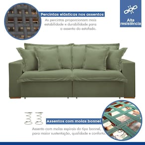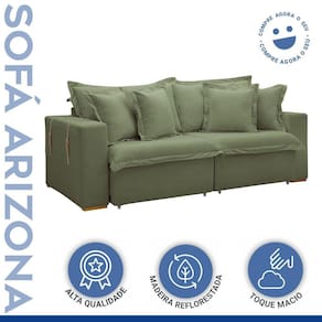 O Sofá Arizona é a solução ideal para quem busca praticidade e conforto. Com um design moderno e elegante. Sua principal característica é a capacidade de se transformar facilmente em uma cama espaçosa, oferecendo versatilidade para receber visitas inesperadas ou para momentos de descanso extra. Renove sua sala de estar com o Sofá Arizona e aproveite o melhor do conforto e da funcionalidade em um só lugar. Acompanha Almofadas extras: Sim Almofada do assento: Fixa Almofada do encosto: Removível Altura do assento até o chão: 50 Altura do Braço: 63 Altura do Encosto: 50 Altura dos Pés: 2.5 Ambiente Principal: Sala de Estar Complexidade da Montagem: Baixa: pode ser montado por uma pessoa sozinha Cor: Verde Cor do Produto: Verde Densidade do Assento: D-28 Densidade do Encosto: D-18 Enchimento do Assento: Espuma Enchimento do Braço: Espuma D-28 Enchimento do Encosto: Fibra Siliconada Firmeza do Assento: Firme Itens Inclusos: 1 sofá, manual de montagem e 04 almofadas decorativas Linha ou Coleção: Arizona Material dos Pés: Madeira Medida como Cama (A x L x P): 100cmx180cmx132cm Modelo: Retrátil e Reclinável Necessita Montagem: Sim Origem do Produto: Nacional Peso: 88.09999999999999 Pet Friendly: Não Possui Baú: Não Possui Percintas Elásticas: Sim Possui Pés: 08 Possui Rodízio: Sim Profundidade Quando Estendido: 150 Quantidade de Itens: 1 Reclinável: Sim Recomendações de Uso, Manutenção e Limpeza: Para limpar, utilize pano seco ou papel absorvente. Não armazenar em local úmido. Não usar produtos químicos como detergente, cloro, alvejantes entre outros. Evitar exposição a luz solar direta por longos períodos. Revestimento do Assento: Boucle Revestimento do Braço: Boucle Revestimento do Encosto: Boucle Rodízio com Trava: Não Sistema de Montagem: Encaixe Tecido Predominante: Não Possui Tipo de Assento: Fixo Tipo de Encosto: Regulável Tipo de Mola: Molas Bonnel Marca: Celflex