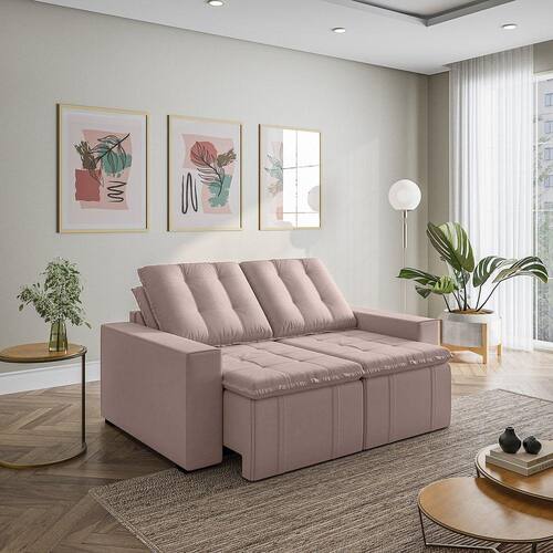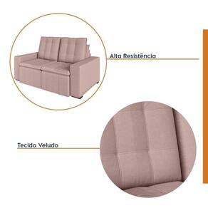 O Sofá Cama Palmeira MadeiraMadeira é a solução perfeita para quem tem pouco espaço disponível. Com ele você poderá acomodar suas visitas com conforto e praticidade. Produzido em madeira maciça de eucalipto, suporta até 400kg. Depois nos conte como foi a experiência de compra e como ficou seu ambiente nos comentários! Acompanha Almofadas extras: Não Almofada do assento: Fixa Almofada do encosto: Removível Altura do assento até o chão: 48 Altura do Encosto: 58 Altura dos Pés: 3 Ambiente Principal: Sala de Estar Complexidade da Montagem: Baixa: pode ser montado por uma pessoa sozinha Cor: Rosa Cor do Produto: Rosa Densidade do Assento: D-23 Densidade do Encosto: Camadas de Densidades Diferentes Enchimento do Assento: Espuma Enchimento do Encosto: Fibra Siliconada Estilo de Braço: Braços Quadrados Firmeza do Assento: Médio Informações Complementares: Densidade Braço D19. Enchimento do encosto: fibra siliconada com flocos de espuma envolvidas com manta siliconada. Itens Inclusos: Sofá, 8 pés e Manual de Montagem Linha ou Coleção: Palmeira Manual de Montagem e Instalação: https://product-hub-prd.madeiramadeira.com.br/877856/documents/c889191f-e321-452f-96a1-c51b469e1be6nualSofCamaPalmeiraSlimalt.pdf Material dos Pés: Polimero Necessita Montagem: Sim Nível de Conforto: Macio Origem do Produto: Nacional Peso: 75 Pet Friendly: Não Possui Entrada USB: Não Possui Percintas Elásticas: Sim Possui Pés: 08 Possui Rodízio: Sim Profundidade Quando Estendido: 148 Recomendações de Uso, Manutenção e Limpeza: Evitar exposição direta à luz solar, limpar com escova macia e aspirar o pó semanalmente, não utilizar produtos químicos, removedores, alvejantes, etc. Evite exercer pressão excessiva sobre determinada partes do estofado, não utilizar para limpeza equipamentos a vapor de água. Resistente à Chuva: Não Revestimento do Braço: Veludo Rodízio com Trava: Não Sistema de Montagem: Parafusos e Engates Suporta Até (kg): 200 Tecido Predominante: Veludo Tipo de Encosto: Regulável Tipo de Mola: Molas Bonnel Ean: 7909903474556