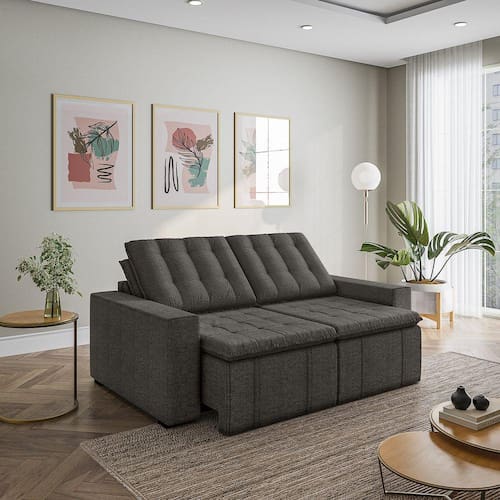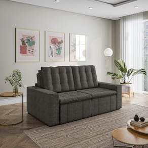 O Sofá Cama Palmeira MadeiraMadeira é a solução perfeita para quem tem pouco espaço disponível. Com ele você poderá acomodar suas visitas com conforto e praticidade. Produzido em madeira maciça de eucalipto, suporta até 400kg. Depois nos conte como foi a experiência de compra e como ficou seu ambiente nos comentários! Acompanha Almofadas extras: Não Almofada do assento: Fixa Almofada do encosto: Removível Altura do assento até o chão: 48 Altura do Encosto: 58 Altura dos Pés: 3 Ambiente Principal: Sala de Estar Complexidade da Montagem: Baixa: pode ser montado por uma pessoa sozinha Cor: Cinza Cor do Produto: Cinza Densidade do Assento: D-23 Densidade do Encosto: Camadas de Densidades Diferentes Enchimento do Assento: Espuma Enchimento do Encosto: Fibra Siliconada Estilo de Braço: Braços Quadrados Firmeza do Assento: Médio Informações Complementares: Densidade Braço D19. Enchimento do encosto: fibra siliconada com flocos de espuma envolvidas com manta siliconada. Itens Inclusos: Sofá, 8 pés e Manual de Montagem Linha ou Coleção: Palmeira Manual de Montagem e Instalação: https://product-hub-prd.madeiramadeira.com.br/877869/documents/16d3c394-892d-4d53-a3c7-6355d4e01960nualSofCamaPalmeiraSlimalt.pdf Material dos Pés: Polimero Necessita Montagem: Sim Nível de Conforto: Macio Origem do Produto: Nacional Peso: 81 Pet Friendly: Não Possui Entrada USB: Não Possui Percintas Elásticas: Sim Possui Pés: 08 Possui Rodízio: Sim Profundidade Quando Estendido: 148 Recomendações de Uso, Manutenção e Limpeza: Evitar exposição direta à luz solar, limpar com escova macia e aspirar o pó semanalmente, não utilizar produtos químicos, removedores, alvejantes, etc. Evite exercer pressão excessiva sobre determinada partes do estofado, não utilizar para limpeza equipamentos a vapor de água. Resistente à Chuva: Não Revestimento do Braço: Linho Rodízio com Trava: Não Sistema de Montagem: Parafusos e Engates Suporta Até (kg): 200 Tecido Predominante: Linho Tipo de Encosto: Regulável Tipo de Mola: Molas Bonnel Ean: 7909903474686