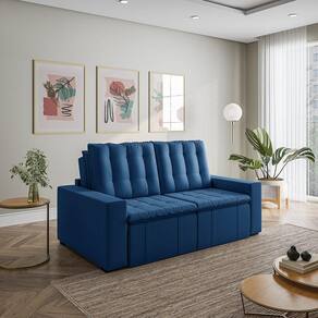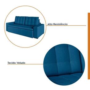 O Sofá Cama Palmeira MadeiraMadeira é a solução perfeita para quem tem pouco espaço disponível. Com ele você poderá acomodar suas visitas com conforto e praticidade. Produzido em madeira maciça de eucalipto, suporta até 400kg. Depois nos conte como foi a experiência de compra e como ficou seu ambiente nos comentários! Acompanha Almofadas extras: Não Almofada do assento: Fixa Almofada do encosto: Removível Altura do assento até o chão: 48 Altura do Encosto: 58 Altura dos Pés: 3 Ambiente Principal: Sala de Estar Complexidade da Montagem: Baixa: pode ser montado por uma pessoa sozinha Cor: Azul Cor do Produto: Azul Densidade do Assento: D-23 Densidade do Encosto: Camadas de Densidades Diferentes Enchimento do Assento: Espuma Enchimento do Encosto: Fibra Siliconada Estilo de Braço: Braços Quadrados Firmeza do Assento: Médio Informações Complementares: Densidade Braço D19. Enchimento do encosto: fibra siliconada com flocos de espuma envolvidas com manta siliconada. Itens Inclusos: Sofá, 8 pés e Manual de Montagem Linha ou Coleção: Palmeira Manual de Montagem e Instalação: https://product-hub-prd.madeiramadeira.com.br/877861/documents/ca54f02f-720a-4363-886c-898597c62d25nualSofCamaPalmeiraSlimalt.pdf Material dos Pés: Polimero Necessita Montagem: Sim Nível de Conforto: Macio Origem do Produto: Nacional Peso: 81 Pet Friendly: Não Possui Entrada USB: Não Possui Percintas Elásticas: Sim Possui Pés: 08 Possui Rodízio: Sim Profundidade Quando Estendido: 148 Recomendações de Uso, Manutenção e Limpeza: Evitar exposição direta à luz solar, limpar com escova macia e aspirar o pó semanalmente, não utilizar produtos químicos, removedores, alvejantes, etc. Evite exercer pressão excessiva sobre determinada partes do estofado, não utilizar para limpeza equipamentos a vapor de água. Resistente à Chuva: Não Revestimento do Braço: Veludo Rodízio com Trava: Não Sistema de Montagem: Parafusos e Engates Suporta Até (kg): 200 Tecido Predominante: Veludo Tipo de Encosto: Regulável Tipo de Mola: Molas Bonnel Ean: 7909903474600