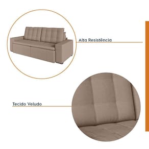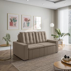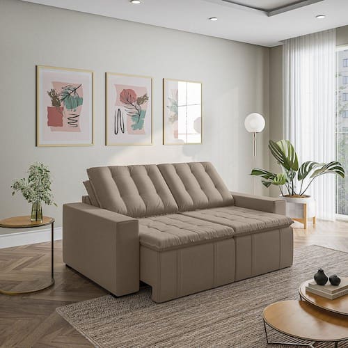 O Sofá Cama Palmeira MadeiraMadeira é a solução perfeita para quem tem pouco espaço disponível. Com ele você poderá acomodar suas visitas com conforto e praticidade. Produzido em madeira maciça de eucalipto, suporta até 400kg. Depois nos conte como foi a experiência de compra e como ficou seu ambiente nos comentários! Acompanha Almofadas extras: Não Almofada do assento: Fixa Almofada do encosto: Removível Altura do assento até o chão: 48 Altura do Encosto: 58 Altura dos Pés: 3 Ambiente Principal: Sala de Estar Complexidade da Montagem: Baixa: pode ser montado por uma pessoa sozinha Cor: Castor Cor do Produto: Castor Densidade do Assento: D-23 Densidade do Encosto: Camadas de Densidades Diferentes Enchimento do Assento: Espuma Enchimento do Encosto: Fibra Siliconada Estilo de Braço: Braços Quadrados Firmeza do Assento: Médio Informações Complementares: Densidade Braço D19. Enchimento do encosto: fibra siliconada com flocos de espuma envolvidas com manta siliconada. Itens Inclusos: Sofá, 8 pés e Manual de Montagem Linha ou Coleção: Palmeira Manual de Montagem e Instalação: https://product-hub-prd.madeiramadeira.com.br/877863/documents/537fa02a-9307-487b-8cbb-3bc471c67616nualSofCamaPalmeiraSlimalt.pdf Material dos Pés: Polimero Necessita Montagem: Sim Nível de Conforto: Macio Origem do Produto: Nacional Peso: 81 Pet Friendly: Não Possui Entrada USB: Não Possui Percintas Elásticas: Sim Possui Pés: 08 Possui Rodízio: Sim Profundidade Quando Estendido: 148 Recomendações de Uso, Manutenção e Limpeza: Evitar exposição direta à luz solar, limpar com escova macia e aspirar o pó semanalmente, não utilizar produtos químicos, removedores, alvejantes, etc. Evite exercer pressão excessiva sobre determinada partes do estofado, não utilizar para limpeza equipamentos a vapor de água. Resistente à Chuva: Não Revestimento do Braço: Veludo Rodízio com Trava: Não Sistema de Montagem: Parafusos e Engates Suporta Até (kg): 200 Tecido Predominante: Veludo Tipo de Encosto: Regulável Tipo de Mola: Molas Bonnel Ean: 7909903474624