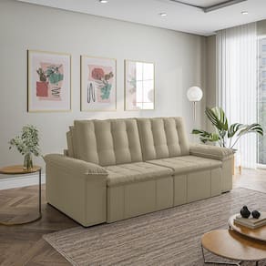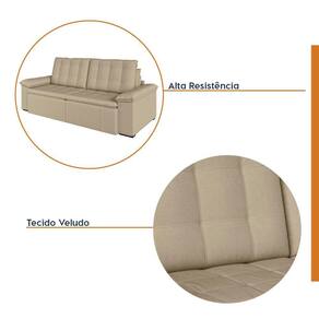 O Sofá Cama Palmeira MadeiraMadeira é a solução perfeita para quem tem pouco espaço disponível. Com ele você poderá acomodar suas visitas com conforto e praticidade. Produzido em madeira maciça de eucalipto, suporta até 400kg. Depois nos conte como foi a experiência de compra e como ficou seu ambiente nos comentários! Acompanha Almofadas extras: Não Almofada do assento: Fixa Almofada do encosto: Removível Altura do assento até o chão: 48 Altura do Encosto: 58 Altura dos Pés: 3 Ambiente Principal: Sala de Estar Complexidade da Montagem: Baixa: pode ser montado por uma pessoa sozinha Cor: Bege Cor do Produto: Bege Densidade do Assento: D-23 Densidade do Encosto: Camadas de Densidades Diferentes Enchimento do Assento: Espuma Enchimento do Encosto: Fibra Siliconada Estilo de Braço: Braços Quadrados Firmeza do Assento: Médio Informações Complementares: Densidade Braço D19. Enchimento do encosto: fibra siliconada com flocos de espuma envolvidas com manta siliconada. Itens Inclusos: 1 Sofá, Kit Ferragens e Manual de Montagem Linha ou Coleção: Palmeira Manual de Montagem e Instalação: https://product-hub-prd.madeiramadeira.com.br/879702/documents/07c20501-68b1-4058-a883-cdd900ee68deanualsofapalmeira240260280.pdf Material dos Pés: Polimero Modelo: Retrátil e Reclinável Necessita Montagem: Sim Nível de Conforto: Macio Origem do Produto: Nacional Peso: 87 Pet Friendly: Não Possui Entrada USB: Não Possui Percintas Elásticas: Sim Possui Pés: 08 Possui Rodízio: Sim Profundidade Quando Estendido: 148 Recomendações de Uso, Manutenção e Limpeza: Evitar exposição direta à luz solar, limpar com escova macia e aspirar o pó semanalmente, não utilizar produtos químicos, removedores, alvejantes, etc. Evite exercer pressão excessiva sobre determinada partes do estofado, não utilizar para limpeza equipamentos a vapor de água. Resistente à Chuva: Não Revestimento do Braço: Veludo Rodízio com Trava: Não Sistema de Montagem: Parafusos e Engates Tecido Predominante: Veludo Tipo de Encosto: Regulável Tipo de Mola: Molas Bonnel
