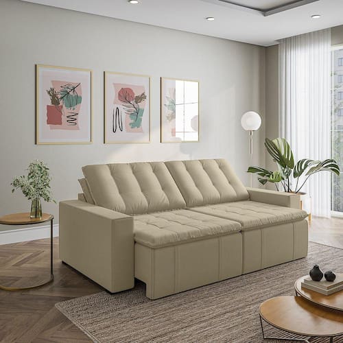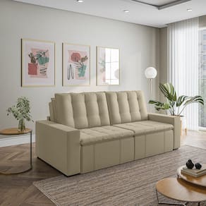 O Sofá Cama Palmeira MadeiraMadeira é a solução perfeita para quem tem pouco espaço disponível. Com ele você poderá acomodar suas visitas com conforto e praticidade. Produzido em madeira maciça de eucalipto, suporta até 400kg. Depois nos conte como foi a experiência de compra e como ficou seu ambiente nos comentários! Acompanha Almofadas extras: Não Almofada do assento: Fixa Almofada do encosto: Removível Altura do assento até o chão: 48 Altura do Encosto: 58 Altura dos Pés: 3 Ambiente Principal: Sala de Estar Complexidade da Montagem: Baixa: pode ser montado por uma pessoa sozinha Cor: Bege Cor do Produto: Bege Densidade do Assento: D-23 Densidade do Encosto: Camadas de Densidades Diferentes Enchimento do Assento: Espuma Enchimento do Encosto: Fibra Siliconada Estilo de Braço: Braços Quadrados Firmeza do Assento: Médio Informações Complementares: Densidade Braço D19. Enchimento do encosto: fibra siliconada com flocos de espuma envolvidas com manta siliconada. Itens Inclusos: Sofá, 8 pés e Manual de Montagem Linha ou Coleção: Palmeira Manual de Montagem e Instalação: https://product-hub-prd.madeiramadeira.com.br/877884/documents/30d72338-a3c5-44aa-a66f-91bca77174ff780ManualSofPalmeira240alt.pdf Material dos Pés: Polimero Necessita Montagem: Sim Nível de Conforto: Macio Origem do Produto: Nacional Peso: 92 Pet Friendly: Não Possui Entrada USB: Não Possui Percintas Elásticas: Sim Possui Pés: 08 Possui Rodízio: Sim Profundidade Quando Estendido: 148 Recomendações de Uso, Manutenção e Limpeza: Evitar exposição direta à luz solar, limpar com escova macia e aspirar o pó semanalmente, não utilizar produtos químicos, removedores, alvejantes, etc. Evite exercer pressão excessiva sobre determinada partes do estofado, não utilizar para limpeza equipamentos a vapor de água. Resistente à Chuva: Não Revestimento do Braço: Veludo Rodízio com Trava: Não Sistema de Montagem: Parafusos e Engates Suporta Até (kg): 200 Tecido Predominante: Veludo Tipo de Encosto: Regulável Tipo de Mola: Molas Bonnel Ean: 7909903474839