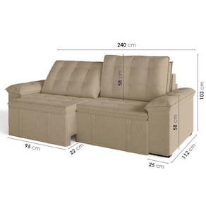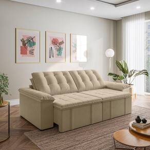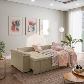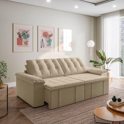 O Sofá Cama Palmeira MadeiraMadeira é a solução perfeita para quem tem pouco espaço disponível. Com ele você poderá acomodar suas visitas com conforto e praticidade. Produzido em madeira maciça de eucalipto, com as seguintes medidas (A x L x P): 103cm x 240cm x 112cm e suporta até 400kg. Depois nos conte como foi a experiência de compra e como ficou seu ambiente nos comentários! Produto Montado: Sim Altura do assento até o chão: 48.0000 Ambiente Principal: Sala de Estar codigo_ean: 7909903193051 Complexidade da Montagem: Baixa: pode ser montado por uma pessoa sozinha Cor: Bege Enchimento do Braço: Fibra Siliconada Enchimento do Encosto: Fibra Siliconada Estilo de Braço: Braços Pillow Top Informações Complementares: Densidade Braço D19. Enchimento do encosto: fibra siliconada com flocos de espuma envolvidas com manta siliconada. Manual de Montagem e Instalação: https://product-hub-prd.madeiramadeira.com.br/814311/documents/8661f231-71df-4d20-983c-237c56dec4692badb3ManualSofPalmeira240.pdf Material dos Pés: Plástico Modelo: Sofá Bipartido Necessita Montagem: Sim Origem do Produto: Nacional Pet Friendly: Não Possui Baú: Não Possui Rodízio: Sim Reclinável: Sim Recomendações de Uso, Manutenção e Limpeza: Evitar exposição direta à luz solar, limpar com escova macia e aspirar o pó semanalmente, não utilizar produtos químicos, removedores, alvejantes, etc. Evite exercer pressão excessiva sobre determinada partes do estofado, não utilizar para limpeza equipamentos a vapor de água. Revestimento do Assento: Veludo Revestimento do Braço: Veludo Revestimento do Encosto: Veludo Sistema de Montagem: Parafusos e Engates Tipo de Mola: Molas Bonnel