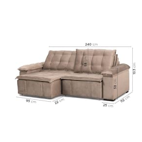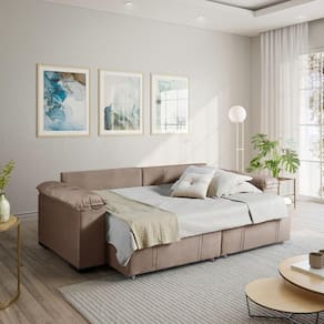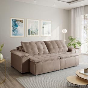 O Sofá Cama Palmeira MadeiraMadeira é a solução perfeita para quem tem pouco espaço disponível. Com ele você poderá acomodar suas visitas com conforto e praticidade. Produzido em madeira maciça de eucalipto, com as seguintes medidas (A x L x P): 103cm x 240cm x 112cm. Depois nos conte como foi a experiência de compra e como ficou seu ambiente nos comentários! Importante: variações na percepção de cor ao comparar o produto físico com a tela do seu celular/computador podem ocorrer. Se possível, visite uma de nossas Guide Shops para ver o produto pessoalmente, ou contate nosso time de vendas para tirar suas dúvidas! Acompanha Almofadas extras: Não Almofada do assento: Fixa Almofada do encosto: Removível Altura do assento até o chão: 48 cm Altura do Encosto: 58 cm Altura dos Pés: 4 cm Ambiente Principal: Sala de Estar Complexidade da Montagem: Baixa: pode ser montado por uma pessoa sozinha Cor: Castor Cor do Produto: Castor Densidade do Assento: D-23 Densidade do Encosto: Camadas de Densidades Diferentes Enchimento do Assento: Espuma Enchimento do Braço: Fibra Siliconada Enchimento do Encosto: Fibra Siliconada Estilo de Braço: Braços Pillow Top Firmeza do Assento: Macio Informações Complementares: Densidade Braço D19. Enchimento do encosto: fibra siliconada com flocos de espuma envolvidas com manta siliconada. Itens Inclusos: 1 Sofá, Acessórios e Instrução de Montagem Linha ou Coleção: Palmeira Manual de Montagem e Instalação: https://cdn2.madeiramadeira.com.br/atributo/takei-estofados/849503-653003.pdf Material dos Pés: Madeira Eucalipto Medida como Cama (A x L x P): 72cm x 240cm x 148cm Modelo: Sofá Bipartido Necessita Montagem: Sim Origem do Produto: Nacional Peso: 79 kg Pet Friendly: Não Possui Baú: Não Possui Percintas Elásticas: Sim Possui Pés: 08 Possui Rodízio: Sim Reclinável: Sim Recomendações de Uso, Manutenção e Limpeza: Evitar exposição direta à luz solar, limpar com escova macia e aspirar o pó semanalmente, não utilizar produtos químicos, removedores, alvejantes, etc. Evite exercer pressão excessiva sobre determinada partes do estofado, não utilizar para limpeza equipamentos a vapor de água. Revestimento do Assento: Veludo Revestimento do Braço: Veludo Revestimento do Encosto: Veludo Rodízio com Trava: Não Sistema de Montagem: Parafusos e Engates Tecido Predominante: Veludo Tipo de Assento: Fixo Tipo de Encosto: Regulável Tipo de Mola: Molas Bonnel