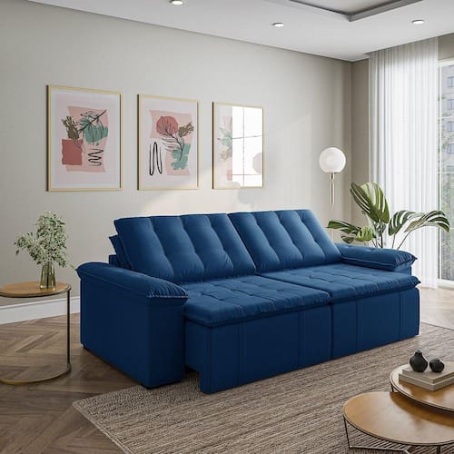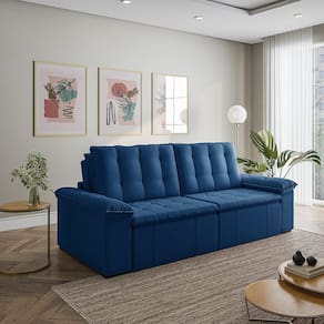 O Sofá Cama Palmeira MadeiraMadeira é a solução perfeita para quem tem pouco espaço disponível. Com ele você poderá acomodar suas visitas com conforto e praticidade. Produzido em madeira maciça de eucalipto, suporta até 400kg. Depois nos conte como foi a experiência de compra e como ficou seu ambiente nos comentários! Acompanha Almofadas extras: Não Almofada do assento: Fixa Almofada do encosto: Removível Altura do assento até o chão: 48 Altura do Encosto: 58 Altura dos Pés: 3 Ambiente Principal: Sala de Estar Complexidade da Montagem: Baixa: pode ser montado por uma pessoa sozinha Cor: Azul Cor do Produto: Azul Densidade do Assento: D-23 Densidade do Encosto: Camadas de Densidades Diferentes Enchimento do Assento: Espuma Enchimento do Encosto: Fibra Siliconada Estilo de Braço: Braços Quadrados Firmeza do Assento: Médio Informações Complementares: Densidade Braço D19. Enchimento do encosto: fibra siliconada com flocos de espuma envolvidas com manta siliconada. Itens Inclusos: 1 Sofá, Kit Ferragens e Manual de Montagem Linha ou Coleção: Palmeira Manual de Montagem e Instalação: https://product-hub-prd.madeiramadeira.com.br/879712/documents/c76acc85-0f98-4e67-9ee1-92418bab0104anualsofapalmeira240260280.pdf Material dos Pés: Polimero Modelo: Retrátil e Reclinável Necessita Montagem: Sim Nível de Conforto: Macio Origem do Produto: Nacional Peso: 93 Pet Friendly: Não Possui Entrada USB: Não Possui Percintas Elásticas: Sim Possui Pés: 08 Possui Rodízio: Sim Profundidade Quando Estendido: 148 Recomendações de Uso, Manutenção e Limpeza: Evitar exposição direta à luz solar, limpar com escova macia e aspirar o pó semanalmente, não utilizar produtos químicos, removedores, alvejantes, etc. Evite exercer pressão excessiva sobre determinada partes do estofado, não utilizar para limpeza equipamentos a vapor de água. Resistente à Chuva: Não Revestimento do Braço: Veludo Rodízio com Trava: Não Sistema de Montagem: Parafusos e Engates Tecido Predominante: Veludo Tipo de Encosto: Regulável Tipo de Mola: Molas Bonnel