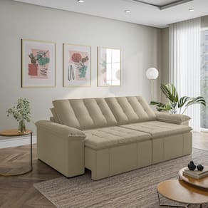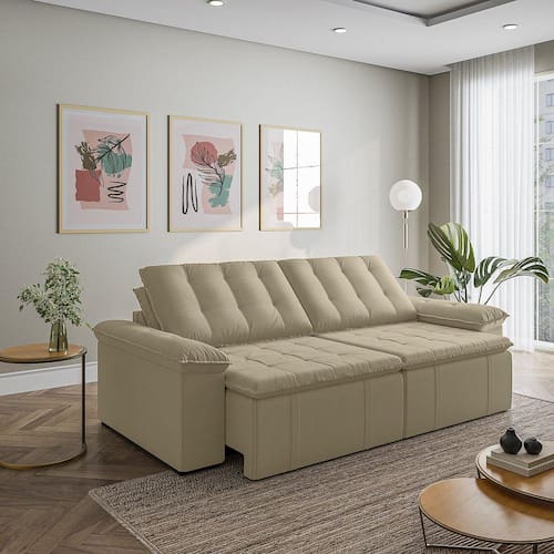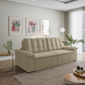 O Sofá Cama Palmeira MadeiraMadeira é a solução perfeita para quem tem pouco espaço disponível. Com ele você poderá acomodar suas visitas com conforto e praticidade. Produzido em madeira maciça de eucalipto, suporta até 400kg. Depois nos conte como foi a experiência de compra e como ficou seu ambiente nos comentários! Acompanha Almofadas extras: Não Almofada do assento: Fixa Almofada do encosto: Removível Altura do assento até o chão: 48 Altura do Encosto: 58 Altura dos Pés: 3 Ambiente Principal: Sala de Estar Complexidade da Montagem: Baixa: pode ser montado por uma pessoa sozinha Cor: Bege Cor do Produto: Bege Densidade do Assento: D-23 Densidade do Encosto: Camadas de Densidades Diferentes Enchimento do Assento: Espuma Enchimento do Encosto: Fibra Siliconada Estilo de Braço: Braços Quadrados Firmeza do Assento: Médio Informações Complementares: Densidade Braço D19. Enchimento do encosto: fibra siliconada com flocos de espuma envolvidas com manta siliconada. Itens Inclusos: 1 Sofá, Kit Ferragens e Manual de Montagem Linha ou Coleção: Palmeira Manual de Montagem e Instalação: https://product-hub-prd.madeiramadeira.com.br/879713/documents/c00fac5a-bbf7-4251-ab39-e49690e02dbaanualsofapalmeira240260280.pdf Material dos Pés: Polimero Modelo: Retrátil e Reclinável Necessita Montagem: Sim Nível de Conforto: Macio Origem do Produto: Nacional Peso: 93 Pet Friendly: Não Possui Entrada USB: Não Possui Percintas Elásticas: Sim Possui Pés: 08 Possui Rodízio: Sim Profundidade Quando Estendido: 148 Recomendações de Uso, Manutenção e Limpeza: Evitar exposição direta à luz solar, limpar com escova macia e aspirar o pó semanalmente, não utilizar produtos químicos, removedores, alvejantes, etc. Evite exercer pressão excessiva sobre determinada partes do estofado, não utilizar para limpeza equipamentos a vapor de água. Resistente à Chuva: Não Revestimento do Braço: Veludo Rodízio com Trava: Não Sistema de Montagem: Parafusos e Engates Tecido Predominante: Veludo Tipo de Encosto: Regulável Tipo de Mola: Molas Bonnel