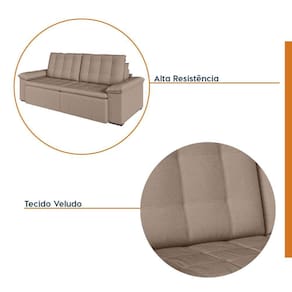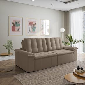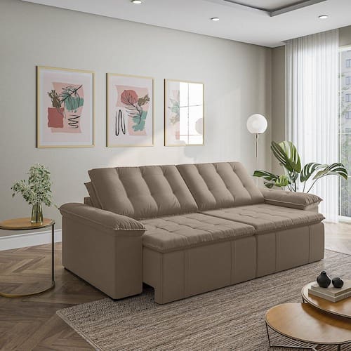 O Sofá Cama Palmeira MadeiraMadeira é a solução perfeita para quem tem pouco espaço disponível. Com ele você poderá acomodar suas visitas com conforto e praticidade. Produzido em madeira maciça de eucalipto, suporta até 400kg. Depois nos conte como foi a experiência de compra e como ficou seu ambiente nos comentários! Acompanha Almofadas extras: Não Almofada do assento: Fixa Almofada do encosto: Removível Altura do assento até o chão: 48 Altura do Encosto: 58 Altura dos Pés: 3 Ambiente Principal: Sala de Estar Complexidade da Montagem: Baixa: pode ser montado por uma pessoa sozinha Cor: Castor Cor do Produto: Castor Densidade do Assento: D-23 Densidade do Encosto: Camadas de Densidades Diferentes Enchimento do Assento: Espuma Enchimento do Encosto: Fibra Siliconada Estilo de Braço: Braços Quadrados Firmeza do Assento: Médio Informações Complementares: Densidade Braço D19. Enchimento do encosto: fibra siliconada com flocos de espuma envolvidas com manta siliconada. Itens Inclusos: 1 Sofá, Kit Ferragens e Manual de Montagem Linha ou Coleção: Palmeira Manual de Montagem e Instalação: https://product-hub-prd.madeiramadeira.com.br/879714/documents/9cdd0899-6753-4a1c-adeb-41d64be06cdbanualsofapalmeira240260280.pdf Material dos Pés: Polimero Modelo: Retrátil e Reclinável Necessita Montagem: Sim Nível de Conforto: Macio Origem do Produto: Nacional Peso: 93 Pet Friendly: Não Possui Entrada USB: Não Possui Percintas Elásticas: Sim Possui Pés: 08 Possui Rodízio: Sim Profundidade Quando Estendido: 148 Recomendações de Uso, Manutenção e Limpeza: Evitar exposição direta à luz solar, limpar com escova macia e aspirar o pó semanalmente, não utilizar produtos químicos, removedores, alvejantes, etc. Evite exercer pressão excessiva sobre determinada partes do estofado, não utilizar para limpeza equipamentos a vapor de água. Resistente à Chuva: Não Revestimento do Braço: Veludo Rodízio com Trava: Não Sistema de Montagem: Parafusos e Engates Tecido Predominante: Veludo Tipo de Encosto: Regulável Tipo de Mola: Molas Bonnel