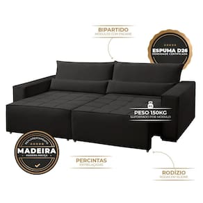 O Nepal é ideal pra quem valoriza liberdade e bem-estar. Com encosto removível e almofadas soltas, se transforma facilmente em uma cama. O design bipartido facilita transporte e montagem, enquanto o assento retrátil amplia o espaço pra relaxar. Estrutura firme em madeira de reflorestamento, espuma D26 com suporte de até 150kg por módulo e rodízios em silicone para movimentação suave. Um sofá que se adapta a você, seja para receber, assistir ou descansar. Produto Montado: Sim Acompanha Almofadas extras: Não Almofada do assento: Fixa Almofada do encosto: Removível Altura do assento até o chão: 45.0000 Altura do Encosto: 36 cm Altura dos Pés: 3 cm Altura Máxima dos Pés: 3.0000 Ambiente Principal: Sala de Estar codigo_ean: 7900288207005 Complexidade da Montagem: Baixa: pode ser montado por uma pessoa sozinha Cor: Preto Cor do Produto: Preto Estilo de Braço: Braços Quadrados Informações Complementares: Almofadas acompanham a cor do sofá. Itens Inclusos: 1 Sofá e Kit Ferragens Linha ou Coleção: Nepal Manual de Especificação Técnica: https://product-hub-prd.madeiramadeira.com.br/962963007/documents/48b79020-ad42-4694-bb63-95633441b7672970589643817488944390105.pdf Manual de Montagem e Instalação: https://product-hub-prd.madeiramadeira.com.br/962963007/documents/09948d8c-e9dc-4e9d-8c0f-be943e530a54afbcb96b0bd476a21747939241.pdf Marca: Apolo Estofados Material dos Pés: Plástico Montagem Flex: Encaixe de encostos, pés e rodízios Necessita Montagem: Sim Origem do Produto: Nacional Peso: 90 kg Pet Friendly: Não Possui Percintas Elásticas: Sim Possui Pés: 08 Possui Rodízio: Sim Profundidade Quando Estendido: 140 cm Profundidade quando extendido: 140.0000 Recomendações de Uso, Manutenção e Limpeza: Recomenda-se aspirar regularmente o sofá para manter o tecido livre de poeira. Em caso de manchas, utilize um pano limpo e umedecido, evitando esfregar com força. Sempre teste produtos de limpeza em uma área discreta antes do uso. Tecidos como microfibra, poliéster e modelos com proteção antimanchas são mais práticos para o dia a dia. Sistema de Montagem: O sofá é enviado com um kit contendo 8 pés, 4 rodízios e os parafusos correspondentes, acondicionados em saco plástico. Para montagem, fixe os pés nos quatro cantos da base, garantindo que estejam apoiados sobre a madeira de reforço. Em seguida, parafuse Suporta Até (kg): 150 kg Tecido Predominante: Suede Tipo de Encosto: Regulável Tipo de Mola: Molas Bonnel Tipo de Sofá: Sofá Cama