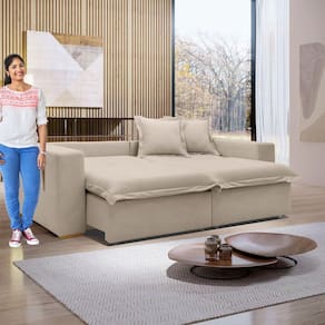 O Sofá Arizona é a solução ideal para quem busca praticidade e conforto. Com um design moderno e elegante. Sua principal característica é a capacidade de se transformar facilmente em uma cama espaçosa, oferecendo versatilidade para receber visitas inesperadas ou para momentos de descanso extra. Renove sua sala de estar com o Sofá Arizona e aproveite o melhor do conforto e da funcionalidade em um só lugar. Acompanha Almofadas extras: Sim Almofada do assento: Fixa Almofada do encosto: Removível Altura do assento até o chão: 50 Altura do Braço: 63 Altura do Encosto: 50 Altura dos Pés: 2.5 Ambiente Principal: Sala de Estar Complexidade da Montagem: Baixa: pode ser montado por uma pessoa sozinha Cor: Bege Cor do Produto: Bege Densidade do Assento: D-28 Densidade do Encosto: D-18 Enchimento do Assento: Espuma Enchimento do Braço: Espuma D-28 Enchimento do Encosto: Fibra Siliconada Firmeza do Assento: Firme Itens Inclusos: 1 Sofá e 4 Almofadas Decorativas Linha ou Coleção: Arizona Material dos Pés: Madeira Medida como Cama (A x L x P): 100cmx200cmx132cm Modelo: Retrátil e Reclinável Necessita Montagem: Sim Origem do Produto: Nacional Peso: 94.2 Pet Friendly: Não Possui Baú: Não Possui Percintas Elásticas: Sim Possui Pés: 08 Possui Rodízio: Sim Profundidade Quando Estendido: 150 Quantidade de Itens: 1 Reclinável: Sim Recomendações de Uso, Manutenção e Limpeza: Para limpar, utilize pano seco ou papel absorvente. Não armazenar em local úmido. Não usar produtos químicos como detergente, cloro, alvejantes entre outros. Evitar exposição a luz solar direta por longos períodos. Revestimento do Assento: Boucle Revestimento do Braço: Boucle Revestimento do Encosto: Boucle Rodízio com Trava: Não Sistema de Montagem: Encaixe Tecido Predominante: Não Possui Tipo de Assento: Fixo Tipo de Encosto: Regulável Tipo de Mola: Molas Bonnel Marca: Celflex