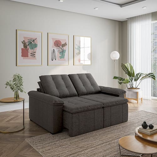 Sofá Palmeira Retrátil Reclinável sem caixa é a solução perfeita para quem tem pouco espaço disponível. Com ele você poderá acomodar suas visitas com conforto e praticidade em ambientes pequenos, a otimização do espaço é um ponto chave para garantir maior conforto e mobilidade. O sofá Palmeira possui braços de apenas 15cm de largura, proporcionando um maior aproveitamento da área disponível na sua sala de estar. Produzido em madeira maciça de eucalipto. Depois nos conte como foi a experiência de compra e como ficou seu ambiente nos comentários. Acompanha Almofadas extras: Não Almofada do assento: Fixa Almofada do encosto: Removível Altura do assento até o chão: 48 Altura do Encosto: 58 Altura dos Pés: 3 Ambiente Principal: Sala de Estar Complexidade da Montagem: Baixa: pode ser montado por uma pessoa sozinha Cor: Chumbo Cor do Produto: Chumbo Densidade do Assento: D-24 Densidade do Encosto: Camadas de Densidades Diferentes Enchimento do Assento: Espuma Enchimento do Encosto: Fibra Siliconada Estilo de Braço: Braços Pillow Top Firmeza do Assento: Médio Informações Complementares: Sofá sem caixa que otimiza o espaço Itens Inclusos: Sofá, 08 pés, Manual de Montagem Linha ou Coleção: Palmeira Manual de Montagem e Instalação: https://cdn2.madeiramadeira.com.br/atributo/takei-estofados/1548236-manual-sofapalmeira180-200-220.pdf Material dos Pés: PVC Necessita Montagem: Sim Origem do Produto: Nacional Peso: 69 Pet Friendly: Não Possui Entrada USB: Não Possui Percintas Elásticas: Sim Possui Pés: 08 Possui Rodízio: Sim Profundidade Quando Estendido: 134 Recomendações de Uso, Manutenção e Limpeza: Evitar exposição direta à luz solar, limpar com escova macia e aspirar o pó semanalmente, não utilizar produtos químicos, removedores, alvejantes, etc. Evite exercer pressão excessiva sobre determinada partes do estofado, não utilizar para limpeza equipamentos a vapor de água. Rodízio com Trava: Não Sistema de Montagem: Encaixe Suporta Até (kg): 300 Tecido Predominante: Linho Tipo de Encosto: Regulável Tipo de Mola: Molas Bonnel