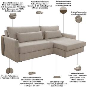 Características: Estrutura em madeira de eucalipto devidamente tratada e aparelhada com reforços e cantoneiras e chapas em MDF. Revestimento em tecido Linho e Couríssimo de alta qualidade na tonalidade Bege Claro e Café. Encosto reclinável por meio de catraca metálica de 5 estágios, com almofada solta composta por 100% de fibra siliconada. Assento retrátil com tubo, composto por espuma D-26, molas espirais e molas ensacadas. Percintas elásticas no encosto e no assento para maior resistência e durabilidade. Braços tapeçados com espuma D-20. Pés em poliuretano e rodízios de silicone. Sofá com design moderno, bipartido com dois assentos. Peso suportado: até 120 kg por assento.