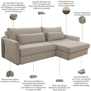 Características: Estrutura em madeira de eucalipto devidamente tratada e aparelhada com reforços e cantoneiras e chapas em MDF. Revestimento em tecido Linho e Couríssimo de alta qualidade na tonalidade Bege Claro e Café. Encosto reclinável por meio de catraca metálica de 5 estágios, com almofada solta composta por 100% de fibra siliconada. Assento retrátil com tubo, composto por espuma D-26, molas espirais e molas ensacadas. Percintas elásticas no encosto e no assento para maior resistência e durabilidade. Braços tapeçados com espuma D-20. Pés em poliuretano e rodízios de silicone. Sofá com design moderno, bipartido com dois assentos. Peso suportado: até 120 kg por assento.