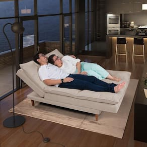 Quem costuma receber visita em casa ou quer manter o centro de entretenimento aconchegante não pode deixar de contar com um Sofá-Cama, né? Por isso, o modelo Vancouver é ideal para unir bom gosto e praticidade de uma só vez. Além da estrutura em Madeira Maciça que oferece um ótimo reforço para o constante, o Assento e o Encosto é de fibra siliconada com persintas elásticas italiana, é muito confortável... vocês não tem idéia do quanto é fofinho e macio, tanto para quem deita como para quem usa como sofá, a peça ainda é revestida em Suede Aveludado e acompanha duas almofadas decorativas 100% fibra siliconada que pode ser usada como travesseiro. De quebra, se transforma rapidamente de sofá para cama e Chaise e ajuda a otimizar até os cômodos mais compactos. Acomoda confortavelmente 2 pessoas deitadas e 3 sentadas, podendo ser em até 5 posições diferentes