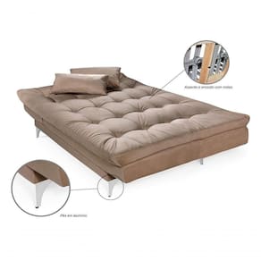 Este sofá cama acomoda tranquilamente 3 pessoas sentadas e duas deitadas, ele pode ser até 5 posições diferentes. Espuma de alto conforto com a densidade tanto no assento como no encosto D26, com percintas elásticas e molas bonel, pés e base em madeira maciça e acompanha duas almofadas que pode ser como travesseiro.
