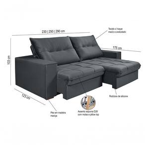 Sofá Retrátil Reclinável Cancún 2,30m com Pillow Top Veludo Sofá retrátil e reclinável com super Pillow Top, espuma D26, molas bonel e percintas italianas. Sofisticação com um design pensado para a vida contemporânea, mesclando a praticidade e o conforto para seu o dia a dia. Um estofado totalmente retrátil e reclinável, seu encosto tem o enchimento com fibra 100% siliconada, revestido no tecido veludo com toque macio e aveludado. Seu encosto reclinável em cinco posições, proporcionando-lhe mais conforto na hora do descanso. Não para por aí: seu assento retrátil conta com espuma D26 com pillow top, transformando seu sofá em uma verdadeira cama para assistir seus esporte/series/filmes favoritos.