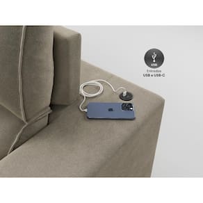 USB:Sofá com uma tomada contendo duas entradas USB para carregamento de eletrônicos, potência de 5V.Não incluso fonte de energia. Extensão do cabo da tomada pode variar de 70cm a 90cm.