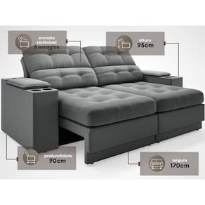 USB:Sofá com uma tomada contendo duas entradas USB para carregamento de eletrônicos, potência de 5V.Não incluso fonte de energia. Extensão do cabo da tomada pode variar de 70cm a 90cm.