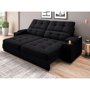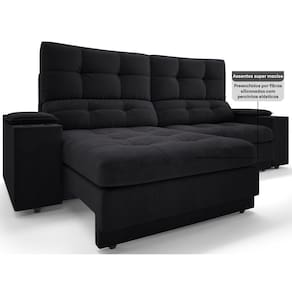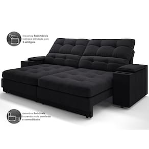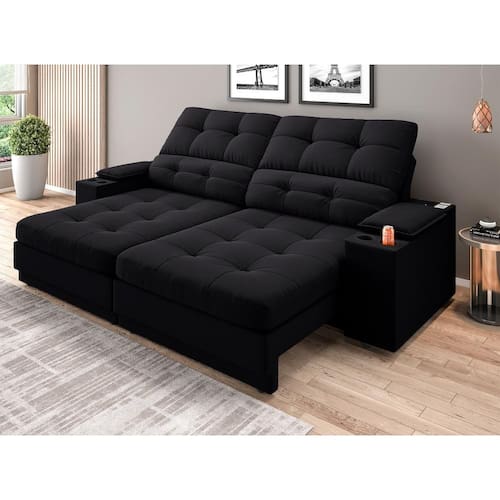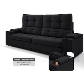 Sofá com Porta Copos e Carregador USB Eureka 2,00m Assento Retrátil e Reclinável Velosuede - NETSOFAS - Preto