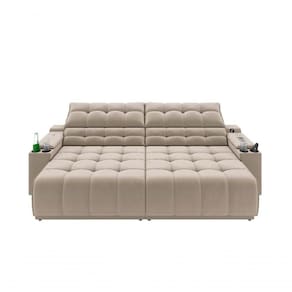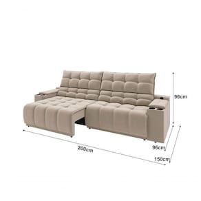 Assento: Espuma D28 para máximo conforto.Encosto: Removível com fibra siliconada.Braço: Espuma D18 com porta copos integrados.Corrediça: Tubular.Pés: PVC.Estrutura: Madeira (Eucalipto/OSB) para durabilidade.Comnto: 200 cm.Altura: 96 cm.Profundidade: 96 cm (abertura de 150 cm).Pillow top: Não.Peso aproximado: 60kg.