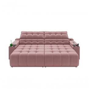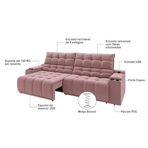 Assento: Espuma D28 para máximo conforto.Encosto: Removível com fibra siliconada.Braço: Espuma D18 com porta copos integrados.Corrediça: Tubular.Pés: PVC.Estrutura: Madeira (Eucalipto/OSB) para durabilidade.Comnto: 230cm.Altura: 96 cm.Profundidade: 96 cm (abertura de 150 cm).Pillow top: Não.Peso aproximado: 60kg.