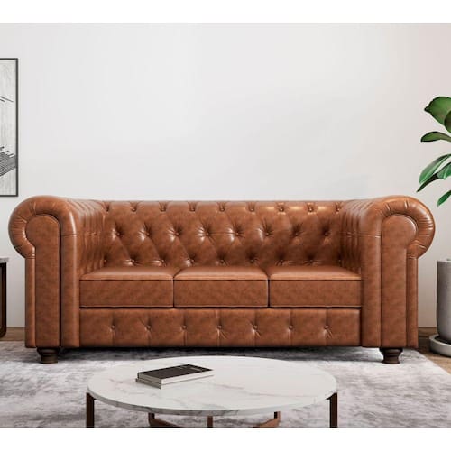 O sofá 3 lugares ou mais Chesterfield Jared é item clássico do mobiliário Inglês, cujo design icônico já existe há 200 anos . É imediatamente reconhecível em sua aparência e complementa perfeitamente qualquer ambiente , sala de estar, recepções , escritórios... Em revestimento de couro facto marrom de alta qualidade , pés de madeira de eucalipto confeccionados exclusivamente para compor a perfeição desse sofá exuberante. Assento com espuma semi soft- D 28 deixando o além de lindo, super macio e confortável. Acompanha Almofadas extras: Não Almofada do assento: Removível Almofada do encosto: Não Possui Altura do assento até o chão: 45 cm Altura do Encosto: 40 cm Altura dos Pés: 10 cm Ambiente Principal: Sala de Estar Cor: Marrom Cor do Produto: Marrom Densidade do Assento: D-28 Enchimento do Assento: Espuma Estilo de Braço: Braços Redondos Firmeza do Assento: Médio Itens Inclusos: 1 Sofá Material dos Pés: Madeira Eucalipto Necessita Montagem: Não Origem do Produto: Nacional Peso: 87 kg Pet Friendly: Não Possui Percintas Elásticas: Sim Possui Pés: 05 Possui Rodízio: Não Recomendações de Uso, Manutenção e Limpeza: Limpar suavemente com pano umedecido em água, de maneira uniforme, secando-o com pano. Revestimento do Braço: Espuma D-28 Suporta Até (kg): 130 kg Tecido Predominante: Couro Sintético Tipo de Encosto: Fixo Tipo de Mola: Não Possui Ean: 7909903413142