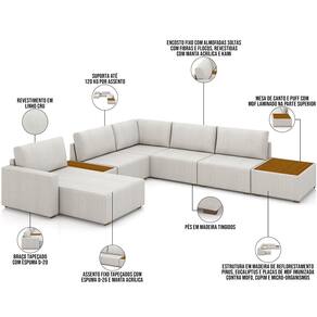 Características: Estrutura em madeira de reflorestamento (pinus, eucaliptus e placas de MDF) imunizada contra mofo, cupim e micro-organismos. Revestimento em tecido Linho de alta qualidade na cor Cru. Assento fixo tapeçados com espuma D-26, manta acrílica. Encosto fixo com almofadas soltas com fibras e flocos, revestidas com manta acrílica e kami. Braços tapeçados com espuma D-20. Cintas elásticas de alta resistência no assento e encosto para maior sustentação. Mesa de Canto e Puff com MDF laminado na parte superior. Pés em madeira tingidos. Peso suportado: Até 120 kg por assento.