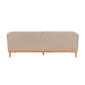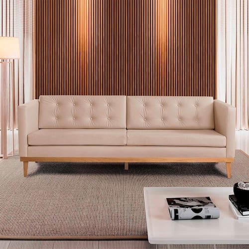 Produto fabricado com madeira de reflorestamento e revestido com sintético. No assento, distribuímos blocos de espuma contínua d28 supersoft, garantindo o conforto e durabilidade do produto. O encosto possui almofadas de espuma d26. Os pés e o rodapé são de madeira maciça.
