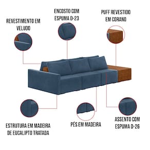 Sofá Ilha 3 Lugares Living 312cm Modulado para Sala Lary Veludo Azul Marinho K01 - D`Rossi