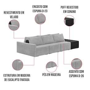 Sofá Ilha 3 Lugares Living 342cm Modulado Sala Lary Veludo Cinza/PU Pto K01 - D`Rossi