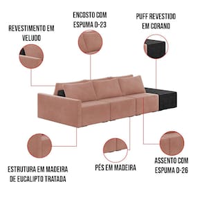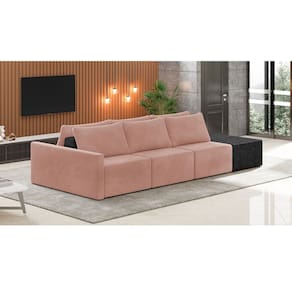 O Sofá Ilha 3 Lugares Living Lary de 342 cm é uma peça de destaque para qualquer ambiente, com um design moderno este sofá apresenta uma estrutura modular permitindo reorganizá-la criando um layout personalizado. Revestido no luxuoso tecido Veludo em um tom envolvente de Rosê, proporcionando uma sensação de aconchego e sofisticação. Seu assento é fixo em espuma D-26 com multimolas de sustentação espiral e ensacadas, solda dupla, manta acrílica e percintas elásticas, suportando até 150 kg por assento. Já o encosto possui espuma D-23 sendo ele removível, com almofadas soltas preenchidas com 100% de fibra siliconada, proporcionando um apoio macio para as costas. Os pés são feitos em madeira certificando maior estabilidade ao móvel. Este sofá apresenta características de alta qualidade, incluindo uma estrutura de madeira tratada de eucalipto reflorestada, garantindo maior resistência e durabilidade ao produto, além de contribuir para a sustentabilidade ambiental. Com sete assentos no total, um deles revestido em tecido Sintético Pu Preto com detalhes em gomos feito com a técnica de costura pespontos, este sofá oferece espaço suficiente para acomodar confortavelmente até oito pessoas, tornando-o ideal para receber amigos e familiares com estilo e conforto. Pode ser utilizado em escritórios, restaurantes e demais ambientes corporativos.O Sofá Lary é a escolha perfeita para quem busca uma peça de mobiliário que une funcionalidade, conforto e estilo em uma única solução para o seu ambiente. Aproveite!
