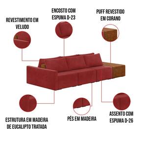 O Sofá Ilha 3 Lugares Living Lary de 402 cm é uma peça de destaque para qualquer ambiente, com um design moderno este sofá apresenta uma estrutura modular permitindo reorganizá-la criando um layout personalizado. Revestido no luxuoso tecido Veludo em um tom envolvente de Vermelho, proporcionando uma sensação de aconchego e sofisticação. Seu assento é fixo em espuma D-26 com multimolas de sustentação espiral e ensacadas, solda dupla, manta acrílica e percintas elásticas, suportando até 150 kg por assento. Já o encosto possui espuma D-23 sendo ele removível, com almofadas soltas preenchidas com 100% de fibra siliconada, proporcionando um apoio macio para as costas. Os pés são feitos em madeira certificando maior estabilidade ao móvel. Este sofá apresenta características de alta qualidade, incluindo uma estrutura de madeira tratada de eucalipto reflorestada, garantindo maior resistência e durabilidade ao produto, além de contribuir para a sustentabilidade ambiental. Com sete assentos no total, um deles revestido em tecido Sintético Pu Nozes com detalhes em gomos feito com a técnica de costura pespontos, este sofá oferece espaço suficiente para acomodar confortavelmente até oito pessoas, tornando-o ideal para receber amigos e familiares com estilo e conforto. Pode ser utilizado em escritórios, restaurantes e demais ambientes corporativos.O Sofá Lary é a escolha perfeita para quem busca uma peça de mobiliário que une funcionalidade, conforto e estilo em uma única solução para o seu ambiente. Aproveite!