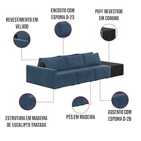 Sofá Ilha 3 Lugares Living 402cm Modulado Sala Lary Veludo Azul Marinho/PU Pto K01 - D`Rossi