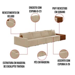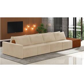 O Sofá Ilha 4 Lugares Living Lary de 432 cm é uma peça de destaque para qualquer ambiente, com um design moderno este sofá apresenta uma estrutura modular permitindo reorganizá-la criando um layout personalizado. Revestido no luxuoso tecido Veludo em um tom envolvente de Bege, proporcionando uma sensação de aconchego e sofisticação. Seu assento é fixo em espuma D-26 com multimolas de sustentação espiral e ensacadas, solda dupla, manta acrílica e percintas elásticas, suportando até 150 kg por assento. Já o encosto possui espuma D-23 sendo ele removível, com almofadas soltas preenchidas com 100% de fibra siliconada, proporcionando um apoio macio para as costas. Os pés são feitos em madeira certificando maior estabilidade ao móvel. Este sofá apresenta características de alta qualidade, incluindo uma estrutura de madeira tratada de eucalipto reflorestada, garantindo maior resistência e durabilidade ao produto, além de contribuir para a sustentabilidade ambiental. Com nove assentos no total, um deles revestido em tecido Sintético Pu Nozes com detalhes em gomos feito com a técnica de costura pespontos, este sofá oferece espaço suficiente para acomodar confortavelmente até dez pessoas, tornando-o ideal para receber amigos e familiares com estilo e conforto. Pode ser utilizado em escritórios, restaurantes e demais ambientes corporativos.O Sofá Lary é a escolha perfeita para quem busca uma peça de mobiliário que une funcionalidade, conforto e estilo em uma única solução para o seu ambiente. Aproveite!