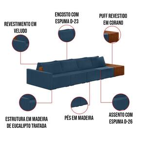 O Sofá Ilha 4 Lugares Living Lary de 472 cm é uma peça de destaque para qualquer ambiente, com um design moderno este sofá apresenta uma estrutura modular permitindo reorganizá-la criando um layout personalizado. Revestido no luxuoso tecido Veludo em um tom envolvente de Azul Marinho, proporcionando uma sensação de aconchego e sofisticação. Seu assento é fixo em espuma D-26 com multimolas de sustentação espiral e ensacadas, solda dupla, manta acrílica e percintas elásticas, suportando até 150 kg por assento. Já o encosto possui espuma D-23 sendo ele removível, com almofadas soltas preenchidas com 100% de fibra siliconada, proporcionando um apoio macio para as costas. Os pés são feitos em madeira certificando maior estabilidade ao móvel. Este sofá apresenta características de alta qualidade, incluindo uma estrutura de madeira tratada de eucalipto reflorestada, garantindo maior resistência e durabilidade ao produto, além de contribuir para a sustentabilidade ambiental. Com nove assentos no total, um deles revestido em tecido Sintético Pu Nozes com detalhes em gomos feito com a técnica de costura pespontos, este sofá oferece espaço suficiente para acomodar confortavelmente até dez pessoas, tornando-o ideal para receber amigos e familiares com estilo e conforto. Pode ser utilizado em escritórios, restaurantes e demais ambientes corporativos.O Sofá Lary é a escolha perfeita para quem busca uma peça de mobiliário que une funcionalidade, conforto e estilo em uma única solução para o seu ambiente. Aproveite!