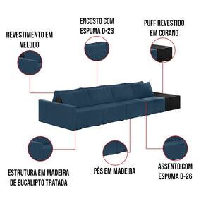 O Sofá Ilha 4 Lugares Living Lary de 472 cm é uma peça de destaque para qualquer ambiente, com um design moderno este sofá apresenta uma estrutura modular permitindo reorganizá-la criando um layout personalizado. Revestido no luxuoso tecido Veludo em um tom envolvente de Azul Marinho, proporcionando uma sensação de aconchego e sofisticação. Seu assento é fixo em espuma D-26 com multimolas de sustentação espiral e ensacadas, solda dupla, manta acrílica e percintas elásticas, suportando até 150 kg por assento. Já o encosto possui espuma D-23 sendo ele removível, com almofadas soltas preenchidas com 100% de fibra siliconada, proporcionando um apoio macio para as costas. Os pés são feitos em madeira certificando maior estabilidade ao móvel. Este sofá apresenta características de alta qualidade, incluindo uma estrutura de madeira tratada de eucalipto reflorestada, garantindo maior resistência e durabilidade ao produto, além de contribuir para a sustentabilidade ambiental. Com nove assentos no total, um deles revestido em tecido Sintético Pu Preto com detalhes em gomos feito com a técnica de costura pespontos, este sofá oferece espaço suficiente para acomodar confortavelmente até dez pessoas, tornando-o ideal para receber amigos e familiares com estilo e conforto. Pode ser utilizado em escritórios, restaurantes e demais ambientes corporativos.O Sofá Lary é a escolha perfeita para quem busca uma peça de mobiliário que une funcionalidade, conforto e estilo em uma única solução para o seu ambiente. Aproveite!