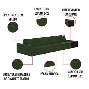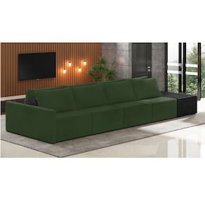 O Sofá Ilha 4 Lugares Living Lary de 512 cm é uma peça de destaque para qualquer ambiente, com um design moderno este sofá apresenta uma estrutura modular permitindo reorganizá-la criando um layout personalizado. Revestido no luxuoso tecido Veludo em um tom envolvente de Verde, proporcionando uma sensação de aconchego e sofisticação. Seu assento é fixo em espuma D-26 com multimolas de sustentação espiral e ensacadas, solda dupla, manta acrílica e percintas elásticas, suportando até 150 kg por assento. Já o encosto possui espuma D-23 sendo ele removível, com almofadas soltas preenchidas com 100% de fibra siliconada, proporcionando um apoio macio para as costas. Os pés são feitos em madeira certificando maior estabilidade ao móvel. Este sofá apresenta características de alta qualidade, incluindo uma estrutura de madeira tratada de eucalipto reflorestada, garantindo maior resistência e durabilidade ao produto, além de contribuir para a sustentabilidade ambiental. Com nove assentos no total, um deles revestido em tecido Sintético Pu Preto com detalhes em gomos feito com a técnica de costura pespontos, este sofá oferece espaço suficiente para acomodar confortavelmente até dez pessoas, tornando-o ideal para receber amigos e familiares com estilo e conforto. Pode ser utilizado em escritórios, restaurantes e demais ambientes corporativos.O Sofá Lary é a escolha perfeita para quem busca uma peça de mobiliário que une funcionalidade, conforto e estilo em uma única solução para o seu ambiente. Aproveite!