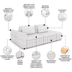 Esse Sofá Living combina elegância de forma única. Feito com madeira de reflorestamento e MDF, ele oferece uma estrutura robusta e durável, enquanto as cintas elásticas no assento e molas espirais garantem um relaxamento incomparável. Com espumas de alta densidade, D-26 no assento, D-23 nos braços e adornos. Este Sofá Cama oferece um conforto notável, perfeito para momentos de relaxamento. O revestimento em Boucle adiciona um toque de elegância e sofisticação, elevando o estilo de qualquer ambiente. Além de ser modulado com encostos removíveis e almofadas soltas permitindo a flexibilidade necessária para seu dia a dia. O Sofá com Puff é um charme, tendo mais assentos para momentos relaxantes, para receber amigos e familiares em um ambiente aconchegante. É a combinação perfeita para quem busca um móvel que se destaque em qualquer decoração. A estabilidade é assegurada pelos pés em madeira tingidos, que também simplificam a montagem.