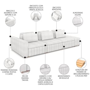 Esse Sofá Living combina elegância de forma única. Feito com madeira de reflorestamento e MDF, ele oferece uma estrutura robusta e durável, enquanto as cintas elásticas no assento e molas espirais garantem um relaxamento incomparável. Com espumas de alta densidade, D-26 no assento, D-23 nos braços e adornos. Este Sofá Cama oferece um conforto notável, perfeito para momentos de relaxamento. O revestimento em Boucle adiciona um toque de elegância e sofisticação, elevando o estilo de qualquer ambiente. Além de ser modulado com encostos removíveis e almofadas soltas permitindo a flexibilidade necessária para seu dia a dia. O Sofá com Puff é um charme, tendo mais assentos para momentos relaxantes, para receber amigos e familiares em um ambiente aconchegante. É a combinação perfeita para quem busca um móvel que se destaque em qualquer decoração. A estabilidade é assegurada pelos pés em madeira tingidos, que também simplificam a montagem.