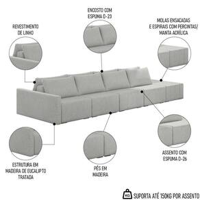 Altura: 82 cm | AssemblyRequired: Sim, sugerimos a contratação do nosso serviço de montagem (para os CEPs em que o serviço está dispon | Color: Cinza | ColorFamily: Cinza | ColorSimple: Cinza | ColorSupplier: Cinza | Cor: Cinza | Gênero: Unisex | Largura: 392 cm | Manual: Sim | Marca: Mpozenato | Material: Madeira de Eucalipto | MaterialFamily: Madeira de Eucalipto | Model: Georgia | Origem: Nacional | OriginCountry: Nacional | OriginState: PR | Peso: 197 kg | Peso Suportado: 150 kg | ProductContents: 1 Sofá Modular | ProductHeight: 82 | ProductInstructions: Produto para uso em ambiente interno, nao devendo ficar exposto ao sol, calor e umidade excessivos. | ProductLength: 160 | ProductWarranty: 90 dias após o recebimento do produto | ProductWeight: 197 | ProductWidth: 392 | Profundidade: 160 cm | Requere montagem: Sim | SizeDescription: 82 x 392 x 160 cm | SupplierSimpleName: Sofá Ilha Modular com Puff para Sala Living 392cm Georgia K04 Linho Cinza - Mpozenato | Tipo de : Fabricante
