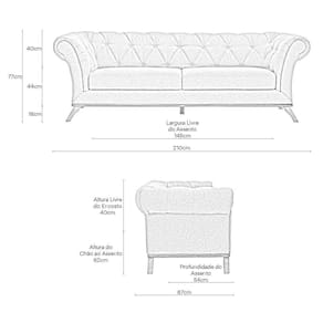 Outras Medidas:Altura do Encosto: 33 cmAltura do Assento ao Chão: 44 cmAltura do Braço: 33 cmAltura dos Pés: 18 cmLargura do Assento: 145 cmProfundidade Livre do Assento: 54 cmLargura do Braço: 32 cm